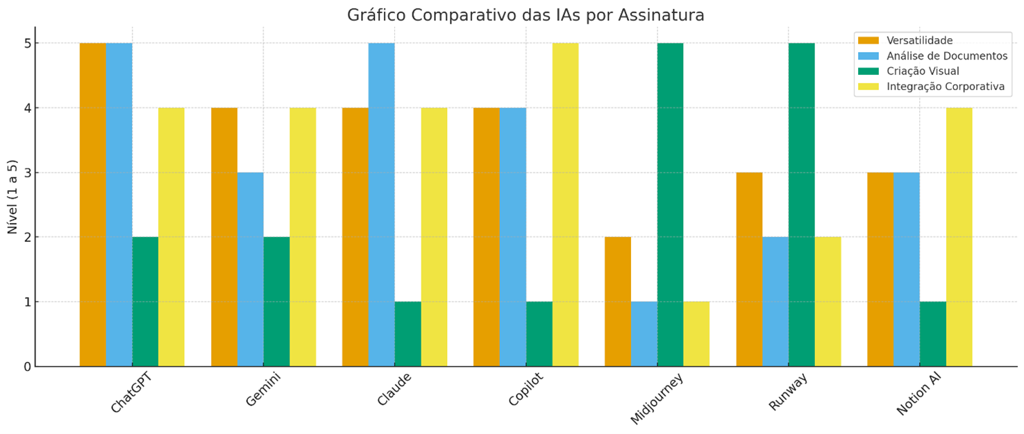 Aqui está o gráfico comparativo visual das principais IAs por assinatura, mostrando seus pontos fortes em quatro dimensões estratégicas: